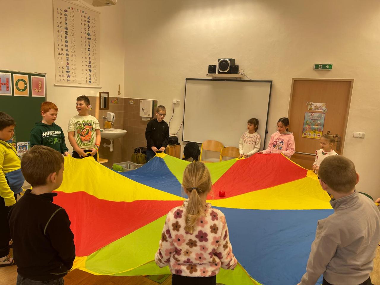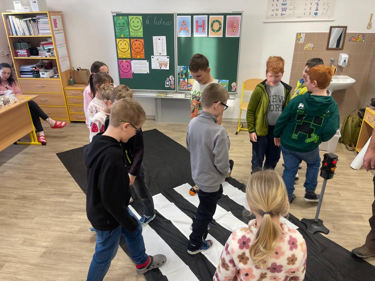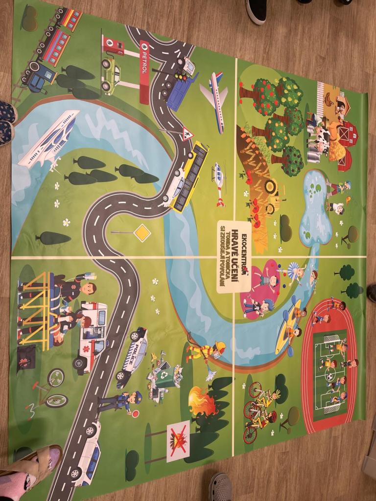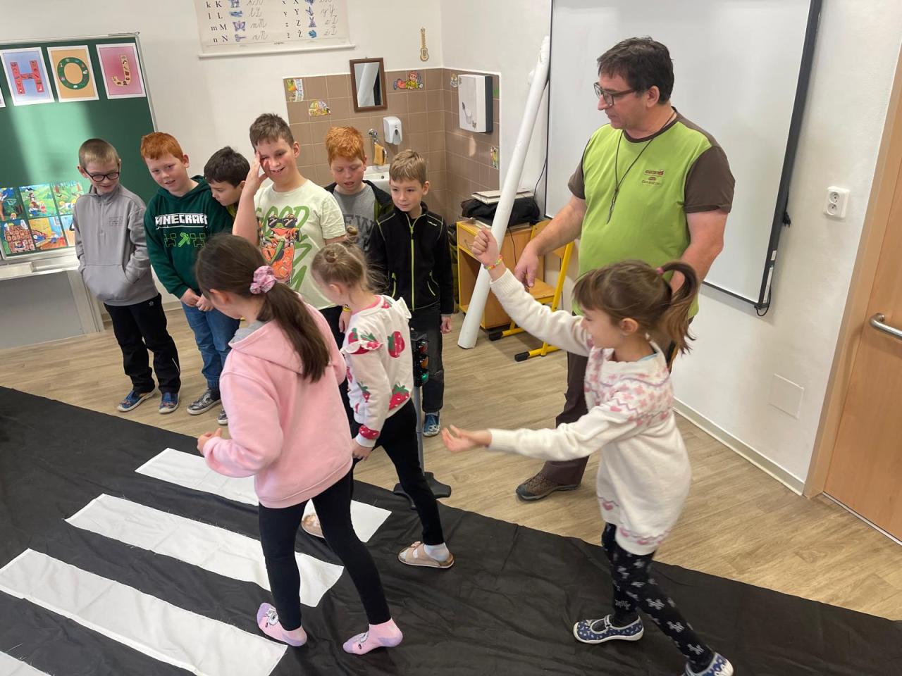Nechyběly v něm zábavné pohybové chvilky s padákem. Děti si také zahrály na řidiče aut a posléze na chodce, přičemž musely svůj pohyb přizpůsobit barvě na semaforu. Nebylo to tak jednoduché, jak se zpočátku zdálo.