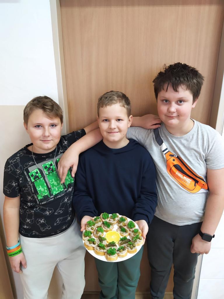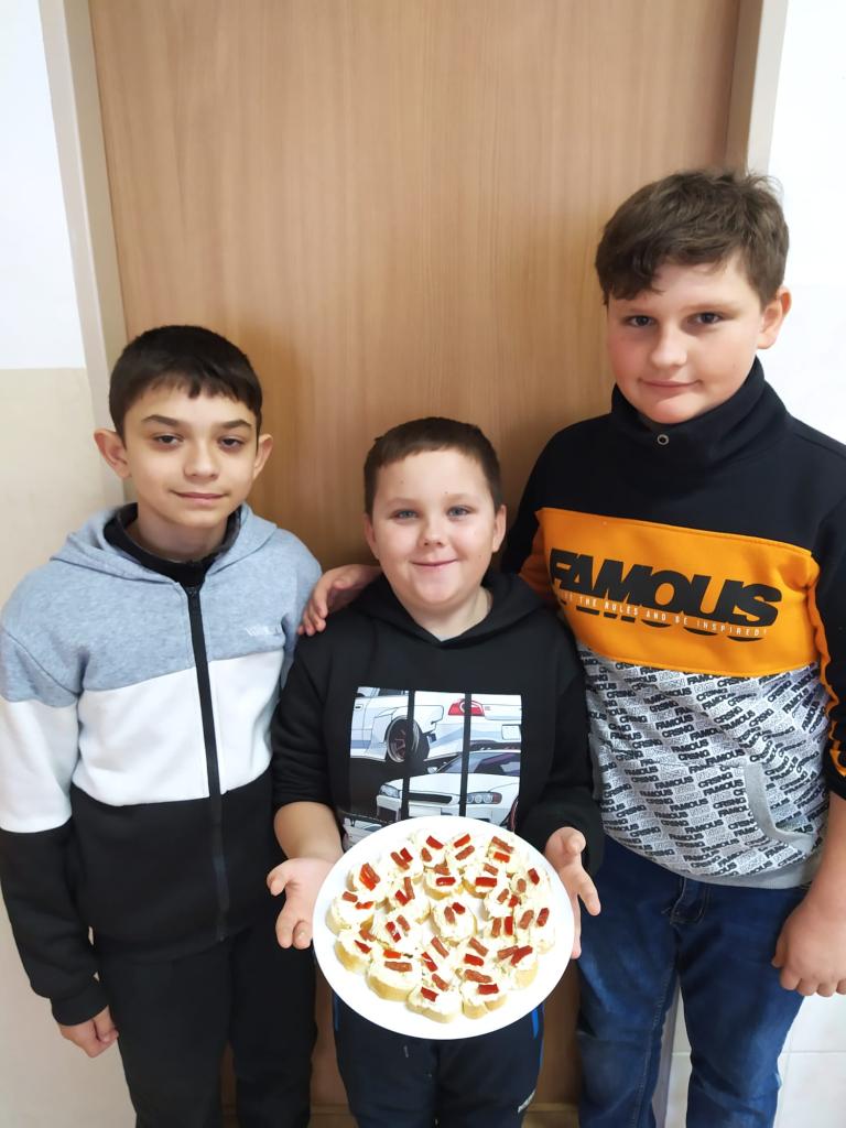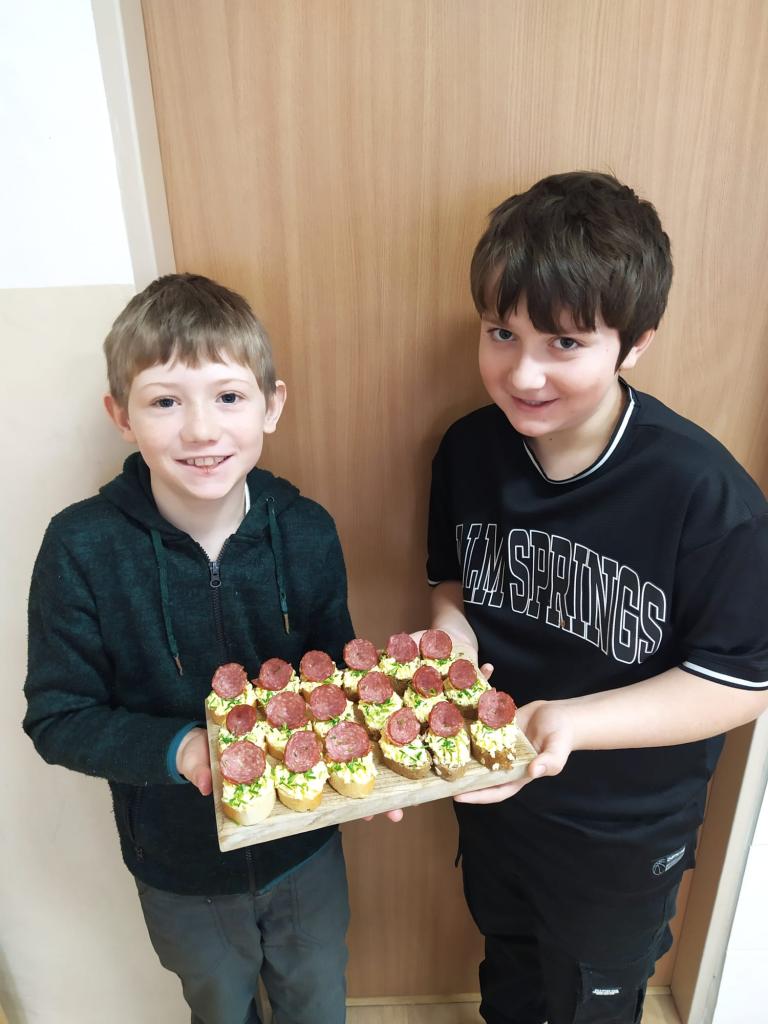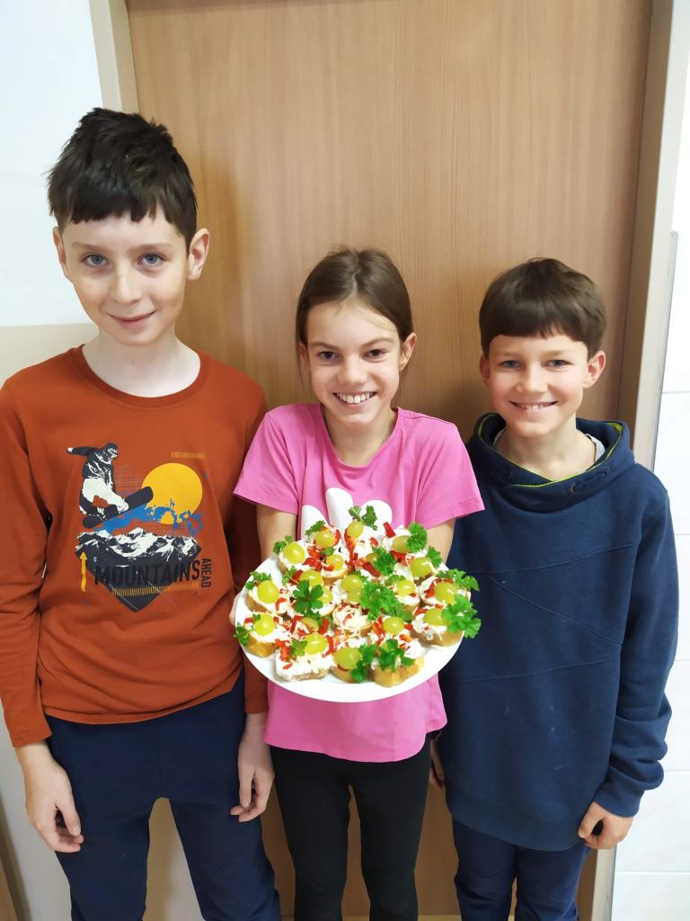 V úterý 13. 1. 2026 dopoledne se žáci 5. třídy pustili do společné přípravy slavnostní svačiny. Nejdříve si ve skupinkách připravili pomazánky a následně nazdobili jednohubky. Vytvořili mistrovská díla, na kterých si poté společně pochutnali. Školou se linula vůně, která přilákala mnoho spolužáků z vyšších ročníků. Žáci byli moc šikovní a práce je bavila. Užili si dopoledne plné vůní a chutí, které jistě brzy zopakují při přípravě sladkých dezertů.