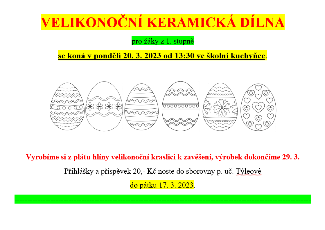 Přihlášku na akci a příspěvek 20,- Kč noste do sborovny organizátorce akce p. uč. Týleové, a to do pátku 17.3. 2023. Závěsné kraslice budou dokončeny 29. 3. 2023.