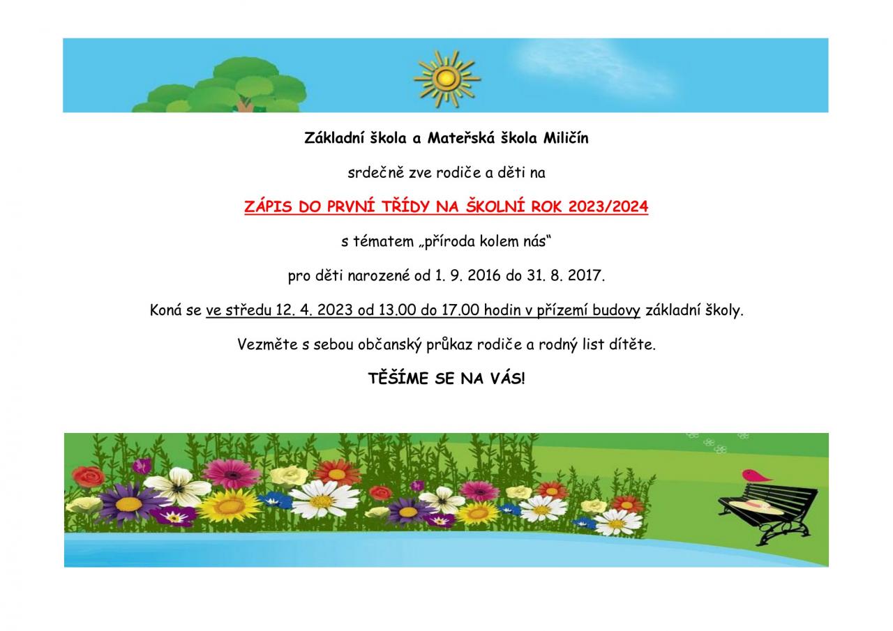 Zápis se uskuteční 12. 4. 2023 mezi 13:00 - 17:00 hodinou v přízemních prostorách ZŠ Miličín. Tématem je letos "příroda okolo nás."